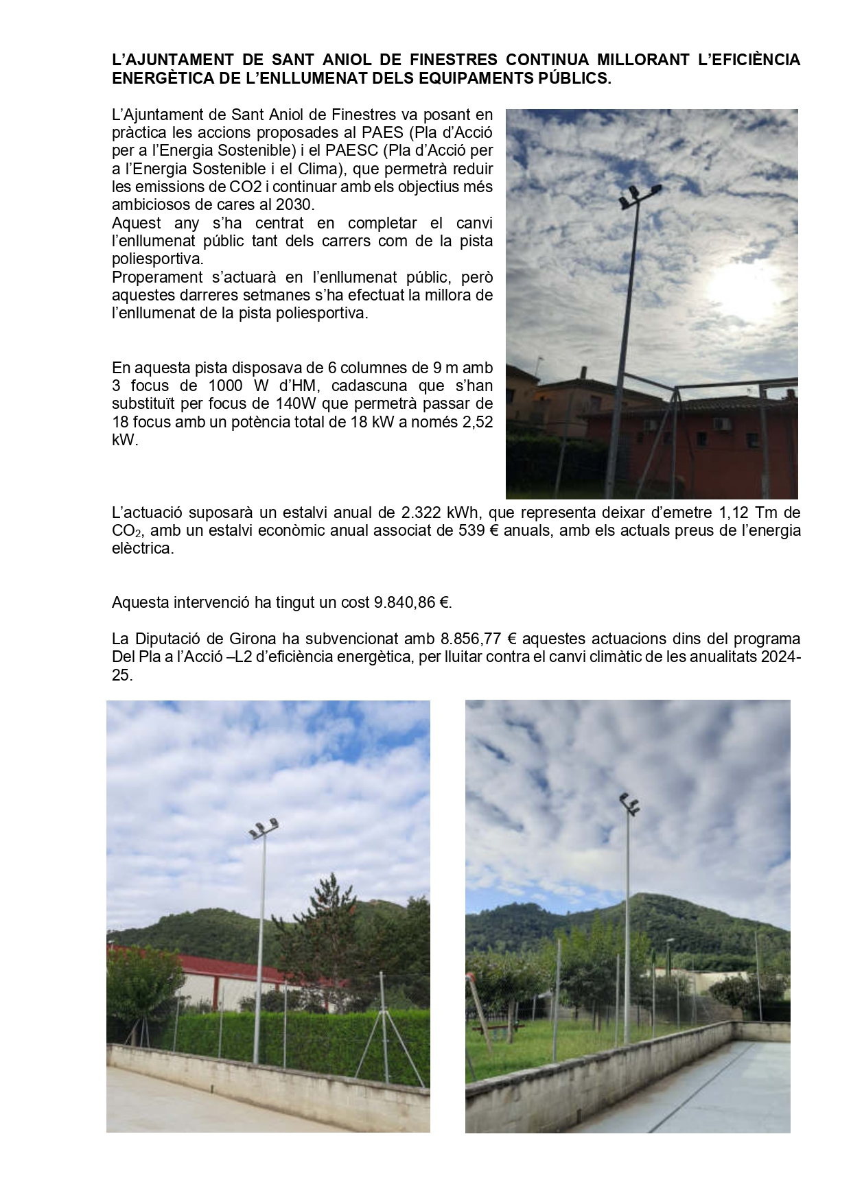 L’AJUNTAMENT DE SANT ANIOL DE FINESTRES CONTINUA MILLORANT L’EFICIÈNCIA ENERGÈTICA DE L’ENLLUMENAT DELS EQUIPAMENTS PÚBLICS